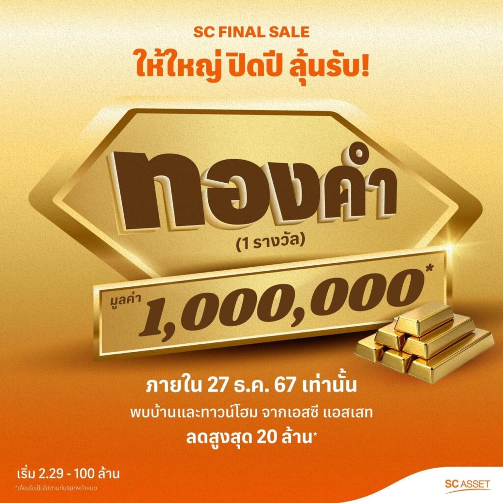 บริษัท เอสซี แอสเสท คอร์ปอเรชั่น จำกัด (มหาชน) แบรนด์อสังหาฯ คุณภาพสูง และ มีนวัตกรรม ครอบคลุมทุกทำเลในกรุงเทพฯ จัดแคมเปญสุดยิ่งใหญ่เพื่อส่งท้ายปี “SC Final Sale ให้ใหญ่ ปิดปี” ผ่านโครงการบ้านหรูคุณภาพสูง ทำเลฮอต กว่า 80 โครงการ ที่มาพร้อมกับข้อเสนอพิเศษสุดคุ้มมากมาย อาทิส่วนลดพิเศษสูงสุดถึง 20 ล้านบาท* รับเงินคืนสูงสุด 1 ล้านบาท* และ ลุ้นรับทองคำมูลค่าถึง 1 ล้านบาท!*