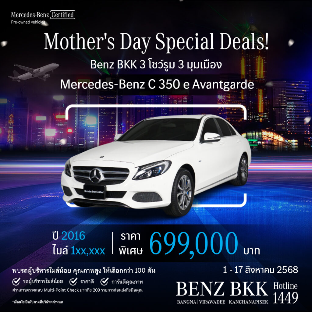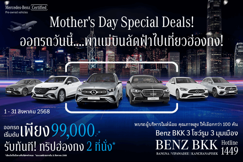 - พิเศษ! จองรถ Mercedes-Benz Certified รุ่นใดก็ได้ ระหว่างวันที่ 7–17 ส.ค. 2568 และรับรถภายใน 31 ส.ค. 2568 รับทันที แพ็กเกจทริปพาคุณแม่ไปมู–ช้อปปิ้งที่ฮ่องกง 2 ที่นั่ง มูลค่ากว่า 40,000 บาท*