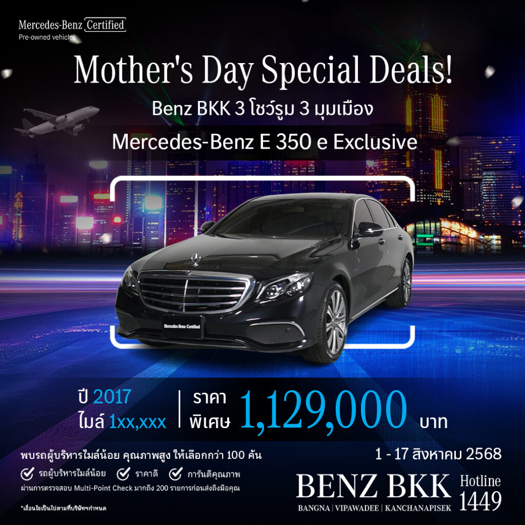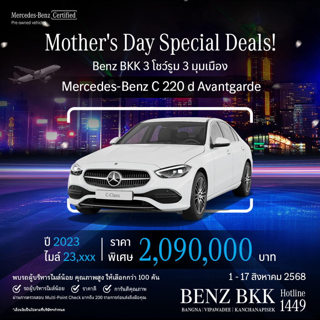 กรุงเทพฯ – 8 สิงหาคม 2568 – Benz BKK Group ผู้แทนจำหน่ายและศูนย์บริการรถยนต์ Mercedes-Benz อย่างเป็นทางการ จัดแคมเปญ “Mother’s Day Special Deals!” ฉลองเทศกาลวันแม่ มอบข้อเสนอสุดคุ้มให้ลูกค้าที่ต้องการเป็นเจ้าของรถยนต์ Mercedes-Benz Certified รถเบนซ์มือสองคุณภาพมาตรฐานเยอรมัน ระหว่างวันที่ 7–17 สิงหาคม 2568 ครอบคลุมทั้ง 3 สาขา บางนา, วิภาวดี และกาญจนาภิเษก