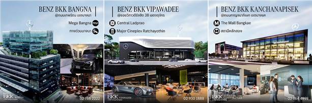 - เบนซ์ บีเคเค กาญจนาภิเษก : ครอบคลุมพื้นที่ฝั่งตะวันตกและปริมณฑล เช่น บางแค ตลิ่งชัน และพื้นที่ใกล้เคียง โทร. 02-764-4999 ต่อ 112 (ฝ่ายขาย) | Line Official: @benzbkkkanchana