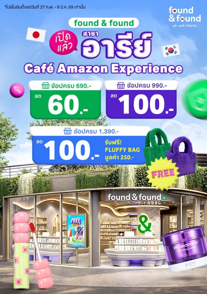 ของผู้ใช้จริง ทำให้การเลือกซื้อสินค้าเหมือนการได้ค้นพบสิ่งใหม่ ๆ ในทุกมุมร้าน found & found Ari ยังคงยึดแนวคิดแบรนด์ “SIMPLE. EASY.EVERYSKIN.” เป็นแกนหลักในการออกแบบประสบการณ์ร้าน ให้การดูแลตัวเองเป็นเรื่องง่าย เข้าถึงได้สำหรับทุกเพศ ทุกวัยและทุกไลฟ์สไตล์ พร้อมคัดสรรสินค้า J/K Beauty ที่มีคุณภาพมาให้ลูกค้าได้ช้อปอย่างครอบคลุม รวมไปถึงแบรนด์ยอดนิยมระดับสากล และสินค้ากระแสหลักจากตลาดเอเชียภายใต้การให้คำปรึกษาแบบ Personalized โดย Beauty Advisor ที่จะช่วยแนะนำตามสภาพผิวและไลฟ์สไตล์ของแต่ละบุคคล พิเศษโปรโมชันฉลองเปิดสาขาใหม่ found & found Ari ตั้งแต่วันที่ 27 กุมภาพันธ์ 2569 – 8 มีนาคม 2569 ช้อปครบ 690 บาท รับส่วนลด 60 บาท ช้อปครบ 990 บาท รับส่วนลด 100 บาท และเพียงช้อปครบ 1,390 บาท